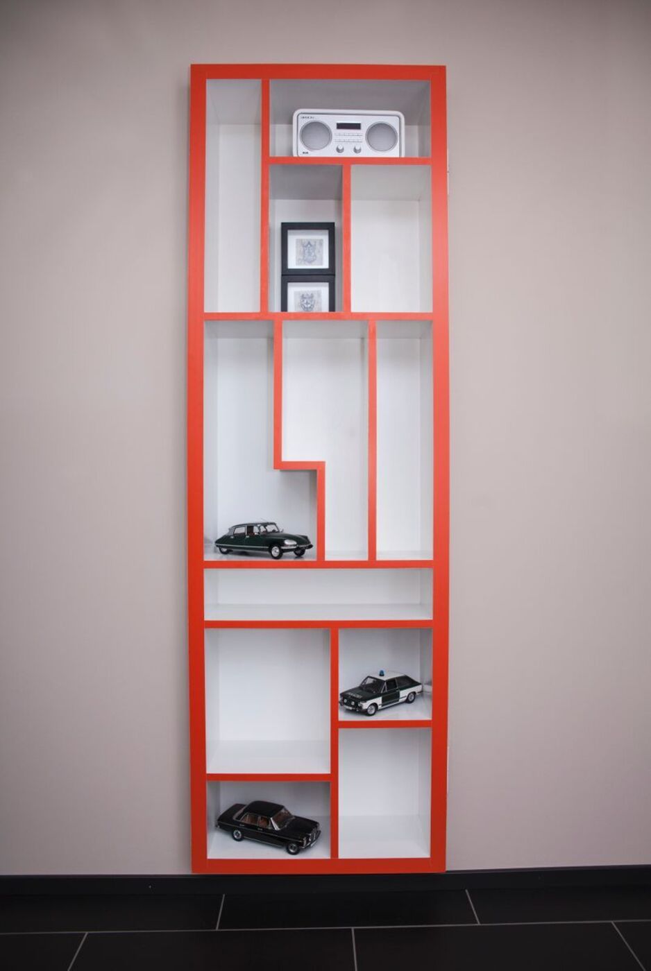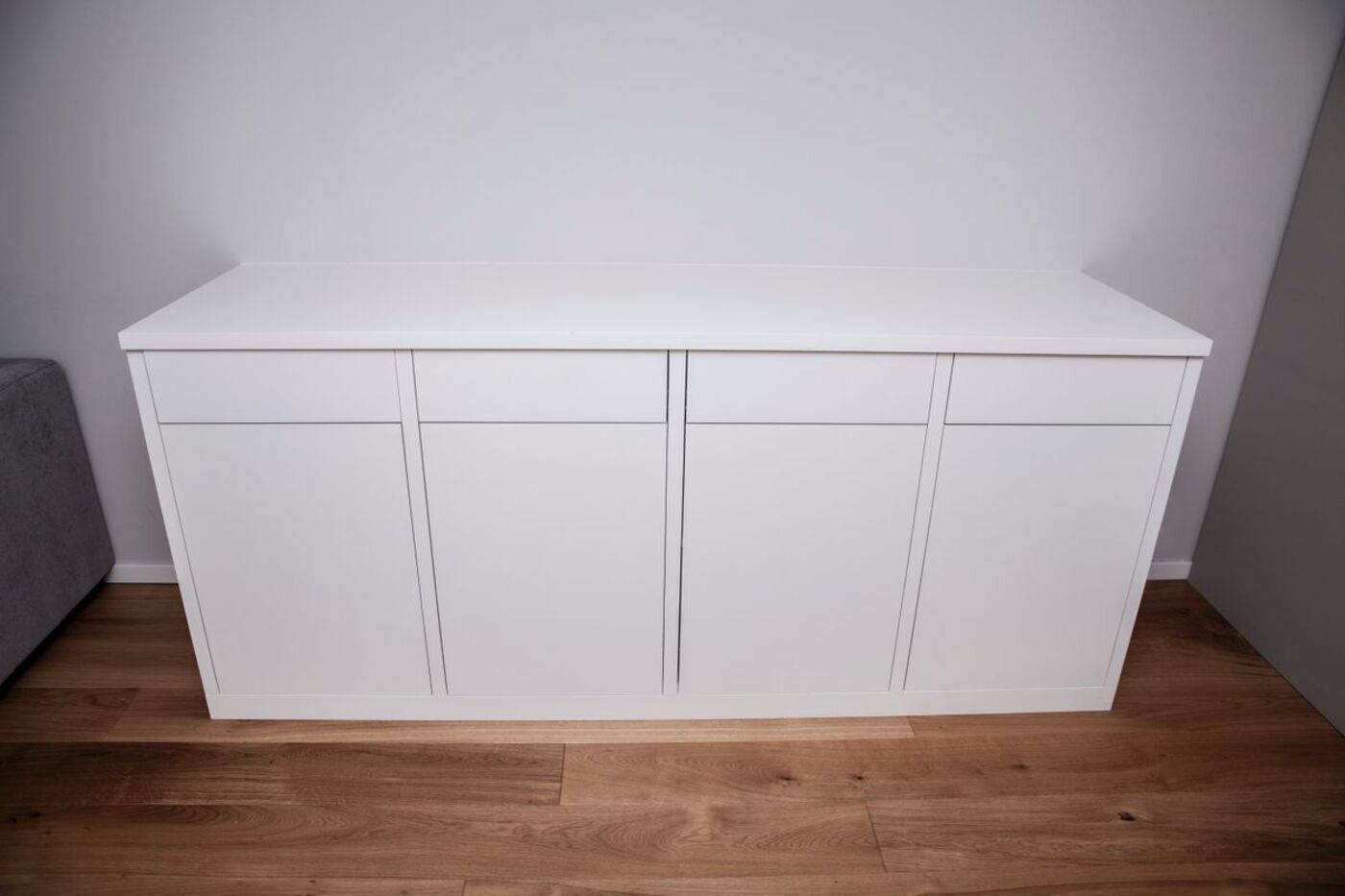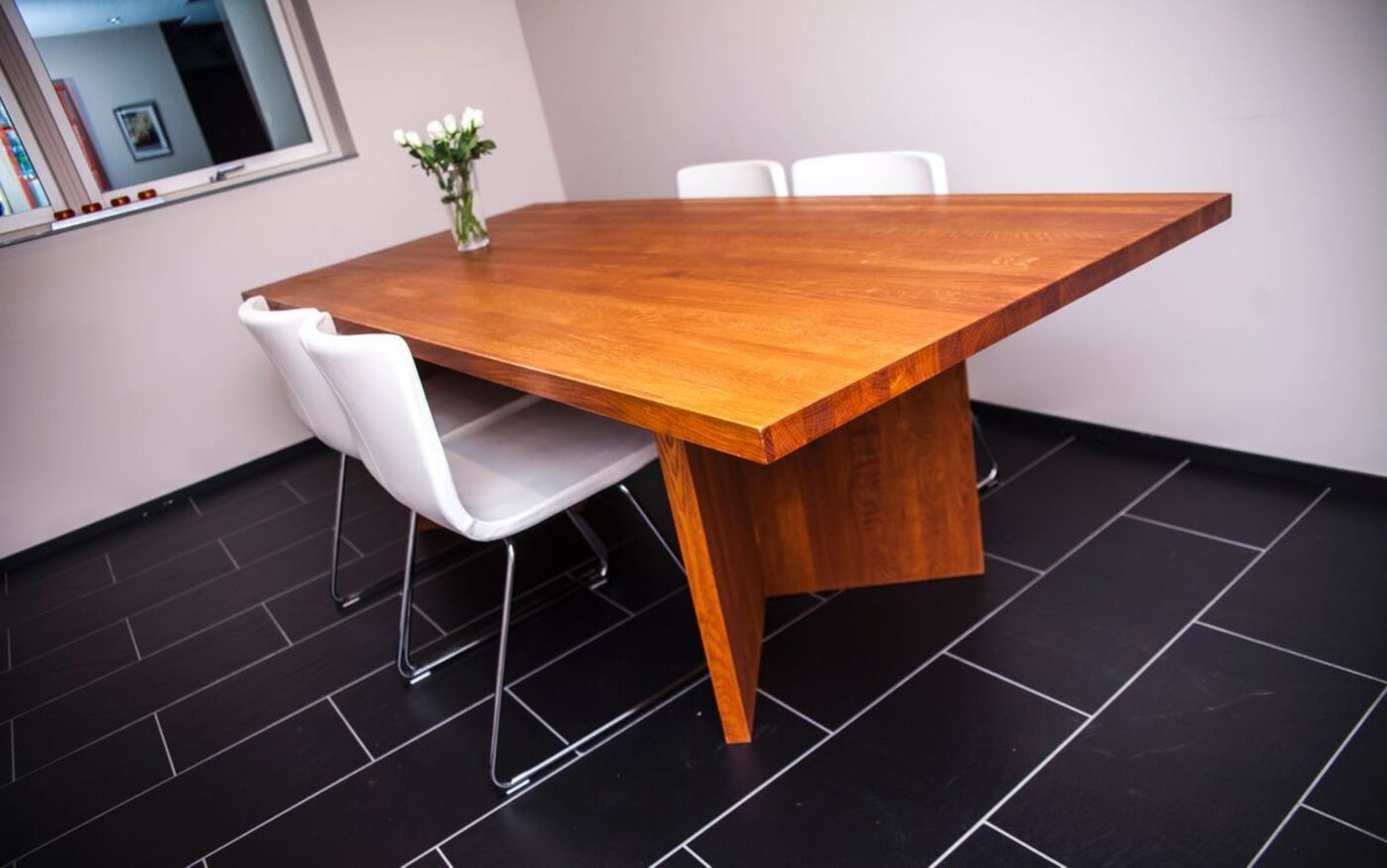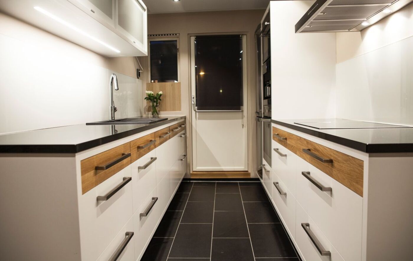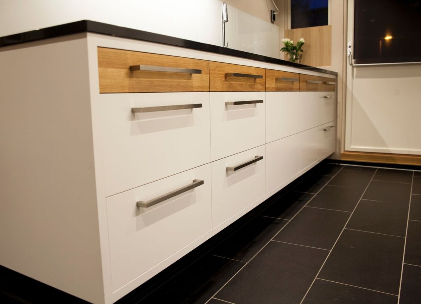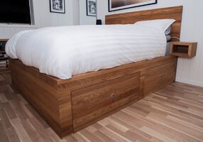 Kjøkken i farvelakkert MDF og heltre eik, gjemt bokhylledør i farvelakkert MDF, skjenk med dører og skuffer i farvelakkert MDF, seng med store skuffer i oljet heltre eik og spisebord i oljet heltre eik levert til privat hjem på Rykkin.
